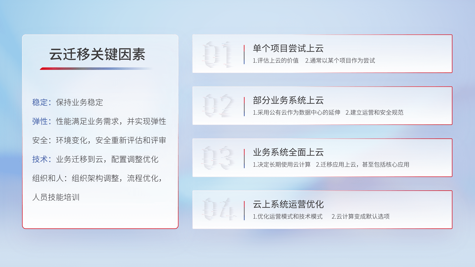 结合实际业务,,,从规划设计、、、云平台选型、、、、云原生改造、、数据迁移、、集成交付,,,迁移全过程为客户识别最佳上云路径,,做好风险识别管理,,,,设计网络架构、、、身份权限、、安全审计合规、、、操作审计、、日志审计、、、监控告警策略、、多站点容灾设计等,,对云上基础设施进行整体规划,,,,提升IT治理水平,,以满足弹性、、、高可用、、、、高性能的需求。。。